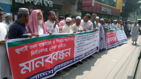 মানববন্ধনে বক্তারা বলেন, বর্তমান নির্বাচনী ব্যবস্থা জনগণের প্রকৃত মতামত প্রতিফলিত করতে ব্যর্থ। দেশে গণতন্ত্র আজ গভীর সংকটে। জনগণের ভোটাধিকার ফিরিয়ে আনতে নির্দলীয় নিরপেক্ষ সরকারের অধীনে নির্বাচন আয়োজনের কোনো বিকল্প নেই।